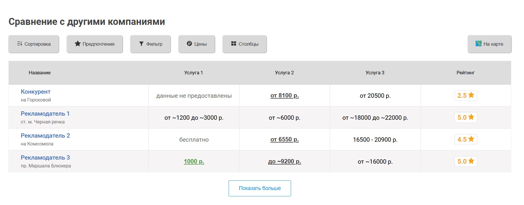 Вокруг продвигаемого таким образом фитнес-центра выбирается некоторое количество ближайших конкурирующих фитнес-центров, продвигаемый фитнес-центр попадёт к ним в таблицу «Сравнение по ценам», которая выглядит следующим образом: